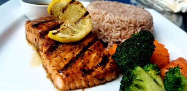 Marinated salmon filet in a citrusy jerk sauce served with a bowl of white rice and a medley of vegetables