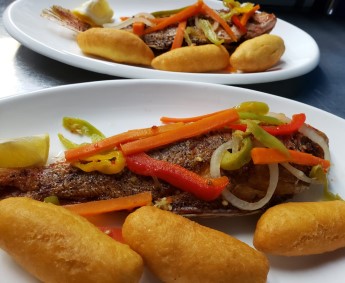 Fried fish sautéed in a sauce made of carrots, peppers onions and vinegar served with festival dumplings
